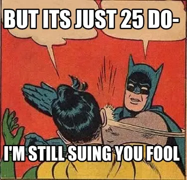 Make your own "But its just 25 do- i'm still suing you fool" meme with MemeCreator's free online meme generator. Add text, stickers, and drawings — then download or share. No watermark, no sign-up required.
