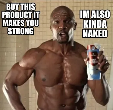 Make your own "Buy this product it makes you strong im also kinda naked" meme with MemeCreator's free online meme generator. Add text, stickers, and drawings — then download or share. No watermark, no sign-up required.