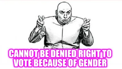Make your own "Cannot be denied right to vote because of Gender" meme with MemeCreator's free online meme generator. Add text, stickers, and drawings — then download or share. No watermark, no sign-up required.