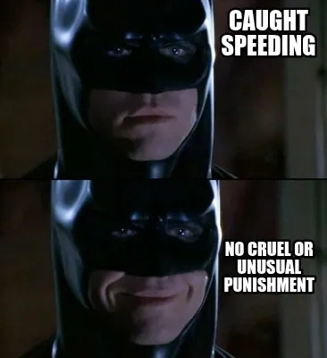 Make your own "Funny caught speeding no cruel or unusual punishment" meme with MemeCreator's free online meme generator. Add text, stickers, and drawings — then download or share. No watermark, no sign-up required.