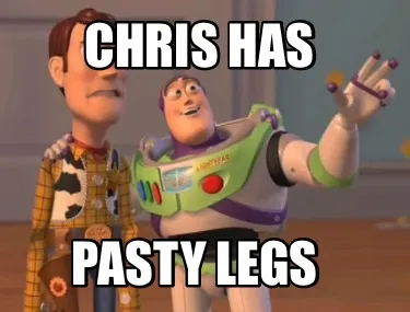 Make your own "Funny Chris has Pasty legs" meme with MemeCreator's free online meme generator. Add text, stickers, and drawings — then download or share. No watermark, no sign-up required.
