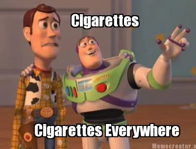 Make your own "Cigarettes Cigarettes Everywhere" meme with MemeCreator's free online meme generator. Add text, stickers, and drawings — then download or share. No watermark, no sign-up required.