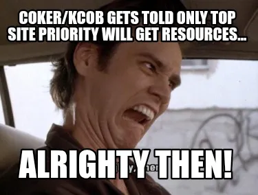 Funny Coker/KCOB gets told only top site priority will get resources... Alrighty then! Meme Template
