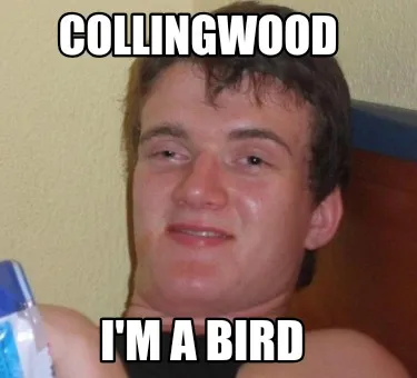 Make your own "Funny Collingwood I'm a bird" meme with MemeCreator's free online meme generator. Add text, stickers, and drawings — then download or share. No watermark, no sign-up required.