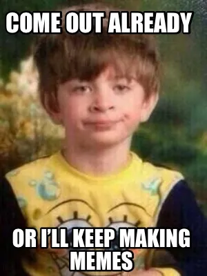 Make your own "Come out already Or I’ll keep making" meme with MemeCreator's free online meme generator. Add text, stickers, and drawings — then download or share. No watermark, no sign-up required.