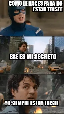 Make your own "Como le haces para no estar triste YO SIEMPRE ESTOY TRISTE ESE ES MI SECRETO" meme with MemeCreator's free online meme generator. Add text, stickers, and drawings — then download or share. No watermark, no sign-up required.
