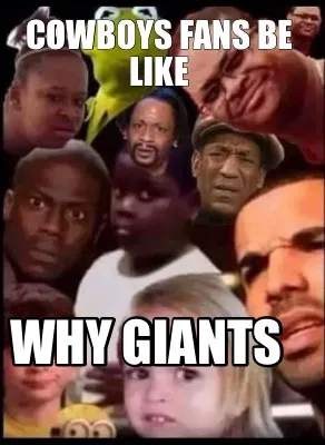 Make your own "Funny Cowboys fans be like Why Giants" meme with MemeCreator's free online meme generator. Add text, stickers, and drawings — then download or share. No watermark, no sign-up required.