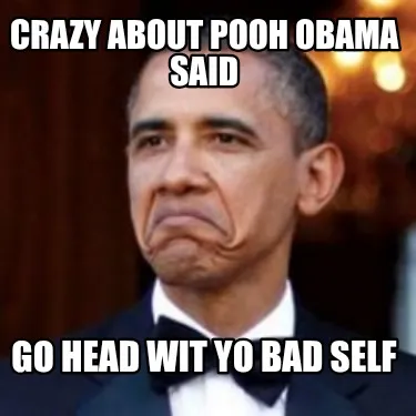 Make your own "CRAZY ABOUT POOH OBAMA SAID GO HEAD WIT YO BAD SELF" meme with MemeCreator's free online meme generator. Add text, stickers, and drawings — then download or share. No watermark, no sign-up required.