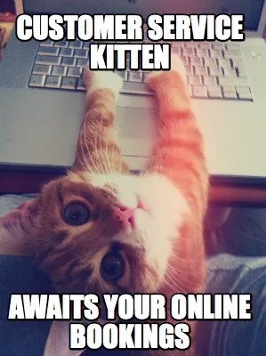 Make your own "Funny customer service kitten awaits your online bookings" meme with MemeCreator's free online meme generator. Add text, stickers, and drawings — then download or share. No watermark, no sign-up required.