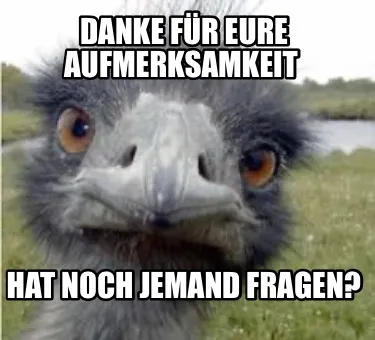 Make your own "Danke für eure Aufmerksamkeit Hat noch jemand Fragen?" meme with MemeCreator's free online meme generator. Add text, stickers, and drawings — then download or share. No watermark, no sign-up required.