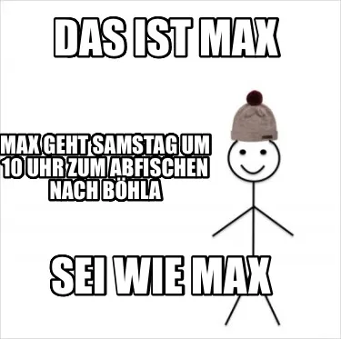 Make your own "Das ist Max Max geht Samstag um 10 Uhr zum Abfischen nach Böhla Sei wie Max" meme with MemeCreator's free online meme generator. Add text, stickers, and drawings — then download or share. No watermark, no sign-up required.