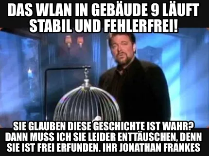 Make your own "Das WLAN in Gebäude 9 läuft stabil und fehlerfrei! Sie glauben diese Geschicht" meme with MemeCreator's free online meme generator. Add text, stickers, and drawings — then download or share. No watermark, no sign-up required.