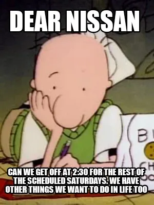 Create Dear Nissan Can we get off at 2:30 for the rest of the scheduled Saturdays. We h Meme