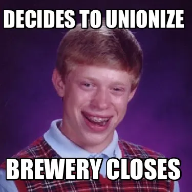 Make your own "Decides to unionize Brewery closes" meme with MemeCreator's free online meme generator. Add text, stickers, and drawings — then download or share. No watermark, no sign-up required.