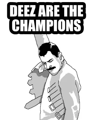 Make your own "Deez are the champions" meme with MemeCreator's free online meme generator. Add text, stickers, and drawings — then download or share. No watermark, no sign-up required.