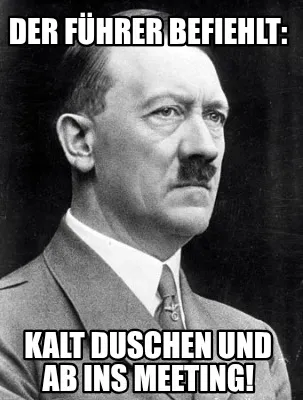 Make your own "Der Führer befiehlt: Kalt Duschen und ab ins Meeting!" meme with MemeCreator's free online meme generator. Add text, stickers, and drawings — then download or share. No watermark, no sign-up required.