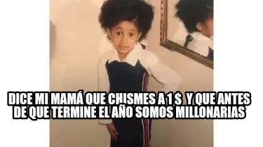 Make your own "Dice mi mamá que chismes a 1 $ y que antes de que termine el año somos millo" meme with MemeCreator's free online meme generator. Add text, stickers, and drawings — then download or share. No watermark, no sign-up required.