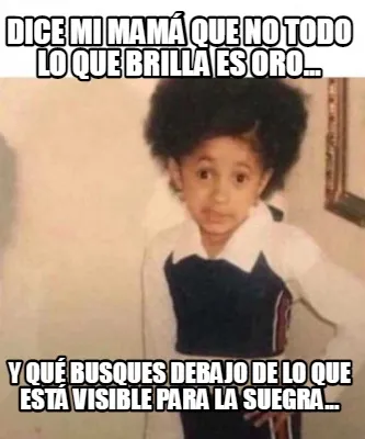 Make your own "Dice mi mamá que no todo lo que brilla es oro... y qué busques debajo de lo qu" meme with MemeCreator's free online meme generator. Add text, stickers, and drawings — then download or share. No watermark, no sign-up required.
