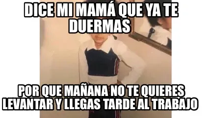 Make your own "Dice mi mamá que ya te duermas Por que mañana no te quieres levantar y llegas" meme with MemeCreator's free online meme generator. Add text, stickers, and drawings — then download or share. No watermark, no sign-up required.