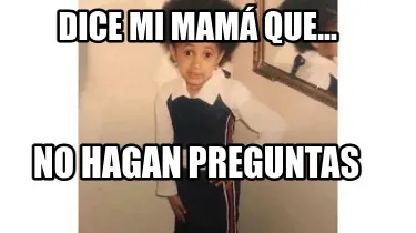 Make your own "Dice mi mamá que... no hagan preguntas" meme with MemeCreator's free online meme generator. Add text, stickers, and drawings — then download or share. No watermark, no sign-up required.