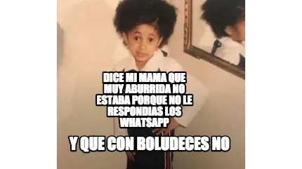 Make your own "Dice mi mama que muy aburrida no estaba porque no le respondias los whatsapp Y q" meme with MemeCreator's free online meme generator. Add text, stickers, and drawings — then download or share. No watermark, no sign-up required.