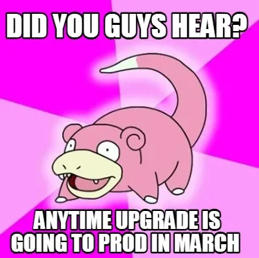 Did you guys hear? Anytime upgrade is going to prod in March Meme Template