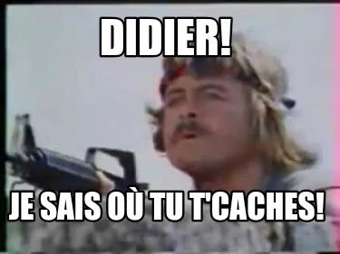 Make your own "Didier! Je sais où tu t'caches!" meme with MemeCreator's free online meme generator. Add text, stickers, and drawings — then download or share. No watermark, no sign-up required.