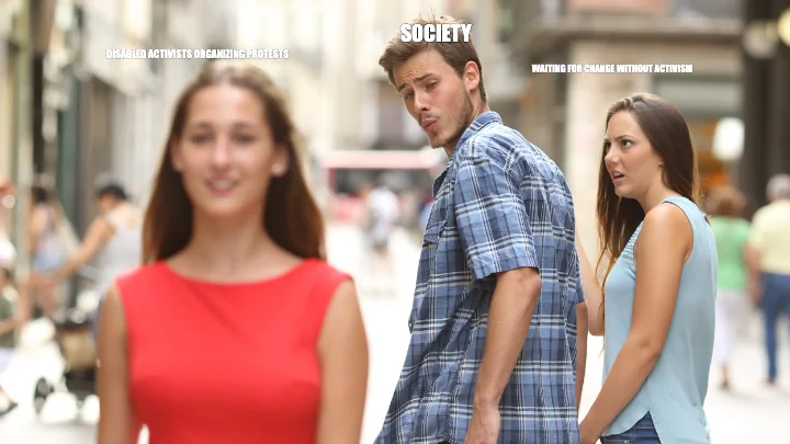 Make your own "DISABLED ACTIVISTS ORGANIZING PROTESTS — SOCIETY — WAITING FOR CHANGE WITHOUT ACTIVISM" meme with MemeCreator's free online meme generator. Add text, stickers, and drawings — then download or share. No watermark, no sign-up required.