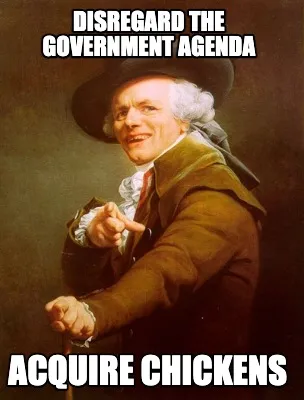 Make your own "Disregard the government Agenda acquire chickens" meme with MemeCreator's free online meme generator. Add text, stickers, and drawings — then download or share. No watermark, no sign-up required.