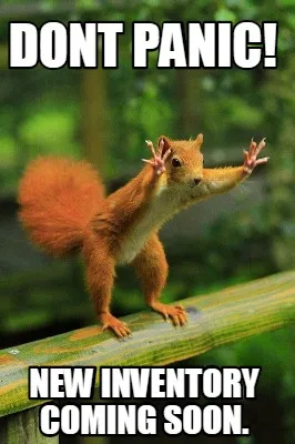 Make your own "Dont Panic! New inventory coming soon." meme with MemeCreator's free online meme generator. Add text, stickers, and drawings — then download or share. No watermark, no sign-up required.