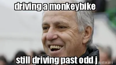 Make your own "Funny driving a monkeybike still driving past odd j" meme with MemeCreator's free online meme generator. Add text, stickers, and drawings — then download or share. No watermark, no sign-up required.