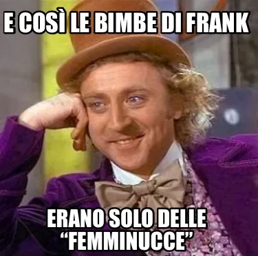 Make your own "E così le bimbe di Frank erano solo delle “femminucce”" meme with MemeCreator's free online meme generator. Add text, stickers, and drawings — then download or share. No watermark, no sign-up required.