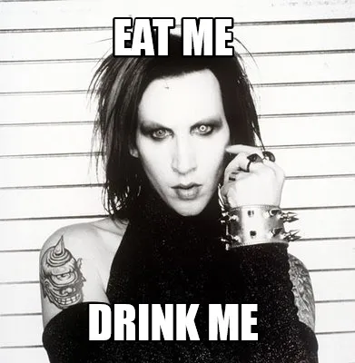 Make your own "Eat me drink me" meme with MemeCreator's free online meme generator. Add text, stickers, and drawings — then download or share. No watermark, no sign-up required.