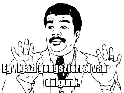 Make your own "Egy igazi gengszterrel van dolgunk." meme with MemeCreator's free online meme generator. Add text, stickers, and drawings — then download or share. No watermark, no sign-up required.