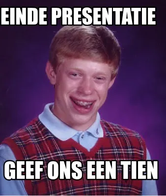 Make your own "Funny einde presentatie geef ons een tien" meme with MemeCreator's free online meme generator. Add text, stickers, and drawings — then download or share. No watermark, no sign-up required.