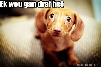 Make your own "Funny Ek wou gan draf het" meme with MemeCreator's free online meme generator. Add text, stickers, and drawings — then download or share. No watermark, no sign-up required.