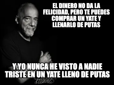 Make your own "El dinero no da la felicidad, pero te puedes comprar un yate y llenarlo de putas" meme with MemeCreator's free online meme generator. Add text, stickers, and drawings — then download or share. No watermark, no sign-up required.