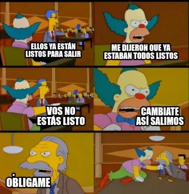Make your own "Ellos ya están listos para salir Me dijeron que ya estaban todos listos Vos no" meme with MemeCreator's free online meme generator. Add text, stickers, and drawings — then download or share. No watermark, no sign-up required.