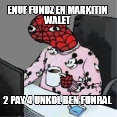 Make your own "Enuf fundz en markitin walet 2 pay 4 unkol ben funral" meme with MemeCreator's free online meme generator. Add text, stickers, and drawings — then download or share. No watermark, no sign-up required.