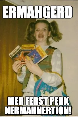 Create Funny ermahgerd Mer ferst perk nermahnertion! Meme