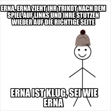 Make your own "Funny Erna, Erna zieht ihr Trikot nach dem Spiel auf links und ihre Stutzen wieder auf" meme with MemeCreator's free online meme generator. Add text, stickers, and drawings — then download or share. No watermark, no sign-up required.