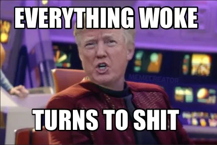 Make your own "Everything woke Turns to shit" meme with MemeCreator's free online meme generator. Add text, stickers, and drawings — then download or share. No watermark, no sign-up required.
