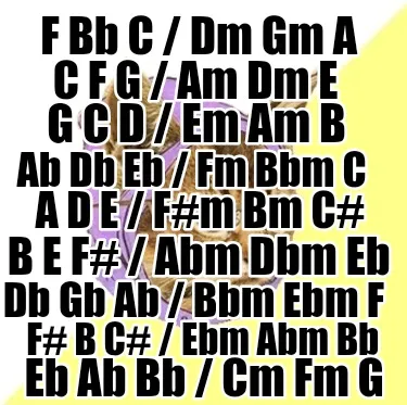 Make your own "F Bb C / Dm Gm A C F G / Am Dm E G C D / Em Am B Ab Db Eb / Fm Bbm C A D E / F#m" meme with MemeCreator's free online meme generator. Add text, stickers, and drawings — then download or share. No watermark, no sign-up required.