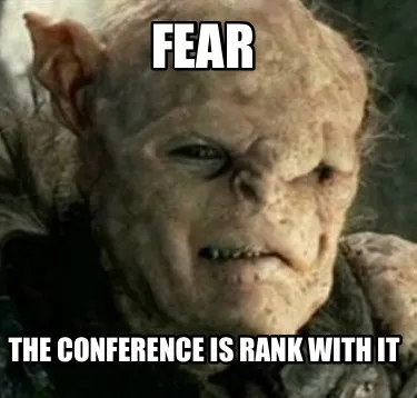 Make your own "Fear The conference is rank with it" meme with MemeCreator's free online meme generator. Add text, stickers, and drawings — then download or share. No watermark, no sign-up required.