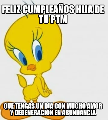 Make your own "Funny Feliz cumpleaños hija de tu ptm Que tengas un dia con mucho amor y degeneració" meme with MemeCreator's free online meme generator. Add text, stickers, and drawings — then download or share. No watermark, no sign-up required.