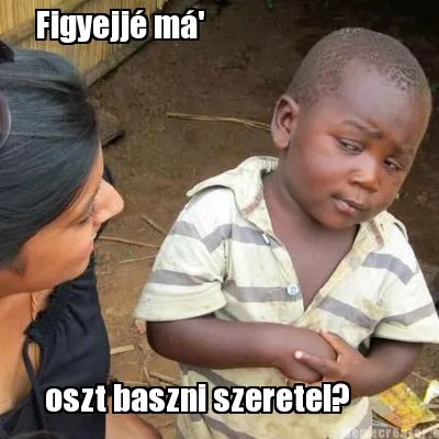 Make your own "Figyejjé má' oszt baszni szeretel?" meme with MemeCreator's free online meme generator. Add text, stickers, and drawings — then download or share. No watermark, no sign-up required.