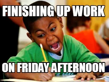 Make your own "Finishing up work on friday afternoon" meme with MemeCreator's free online meme generator. Add text, stickers, and drawings — then download or share. No watermark, no sign-up required.