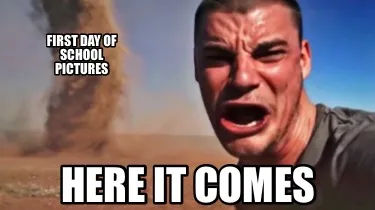 Make your own "First day of school pictures Here it comes" meme with MemeCreator's free online meme generator. Add text, stickers, and drawings — then download or share. No watermark, no sign-up required.