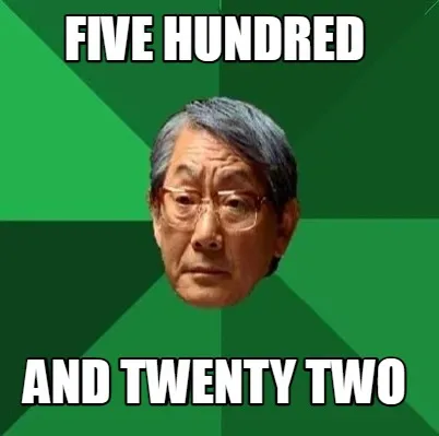 Make your own "Five Hundred And Twenty Two" meme with MemeCreator's free online meme generator. Add text, stickers, and drawings — then download or share. No watermark, no sign-up required.