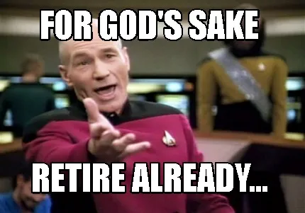 Make your own "For god's sake retire already..." meme with MemeCreator's free online meme generator. Add text, stickers, and drawings — then download or share. No watermark, no sign-up required.